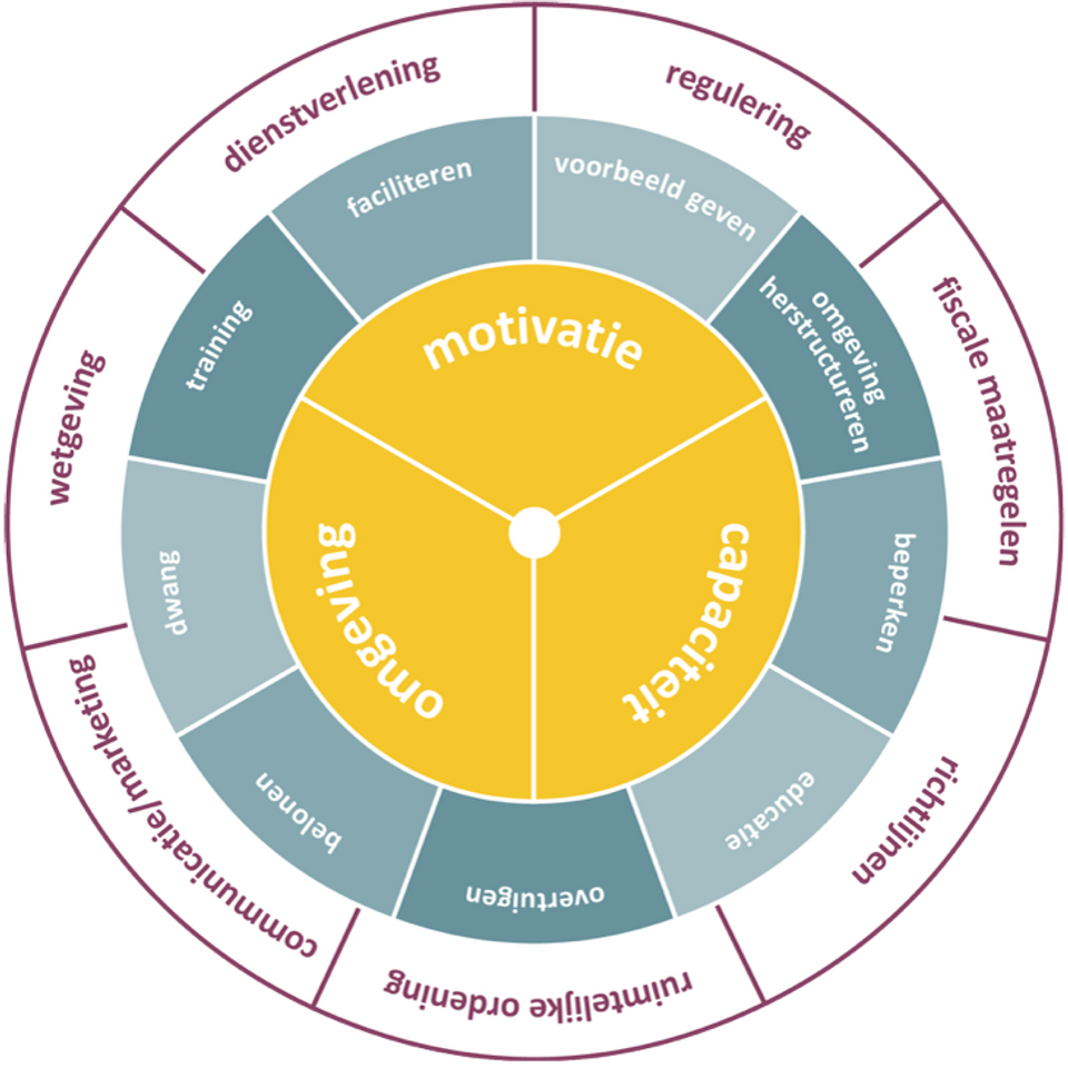 Waar COM-B vooral helpt bij het begrijpen van gedrag en wat er nodig is om het gewenste gedrag te realiseren, helpt deze laag je bij het ontwerpen van die verandering. Deze ring laat zien dat er meerdere routes zijn om gedrag te beïnvloeden: niet alleen via communicatie of bewustwording, maar juist ook via de structuren en regels die het gedrag in stand houden. Door interventies slim te combineren, werk je op verschillende niveaus van het systeem tegelijk.