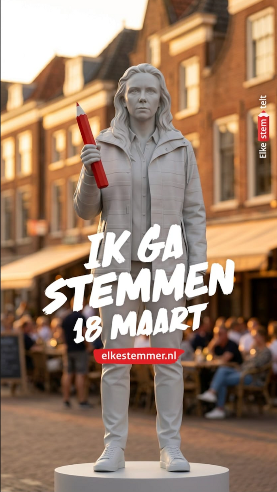 In de eerste twee weken van de campagne, roepen we mensen op om ook een standbeeld van zichzelf als stemmer te maken. Als standbeeld krijg je een typisch rood stempotlood in je handen. Zo wordt extra benadrukt dat je een stemmer bent. Uit onderzoek blijkt namelijk dat als je jezelf ziet als stemmer, de kans groot is dat je ook echt gaat stemmen.